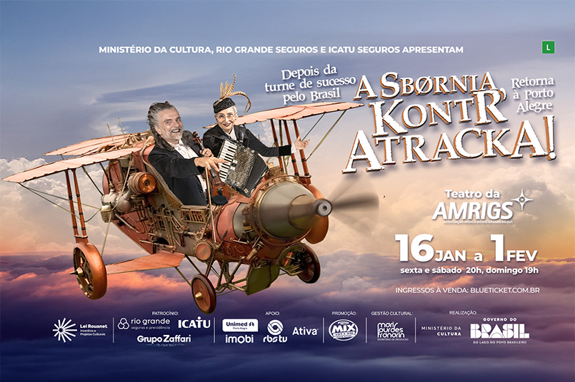 Já estão à venda os ingressos para a temporada de verão de “A Sbørnia Kontr’Atracka”, que retorna a Porto Alegre após uma turnê de sucesso por diversas capitais brasileiras. O espetáculo, protagonizado por Hique Gomez e Simone Rasslan, terá nove apresentações, de 16 de janeiro a 1º de fevereiro, no Teatro da AMRIGS, sempre às sextas e sábados, às 20h, e domingos, às 19h.